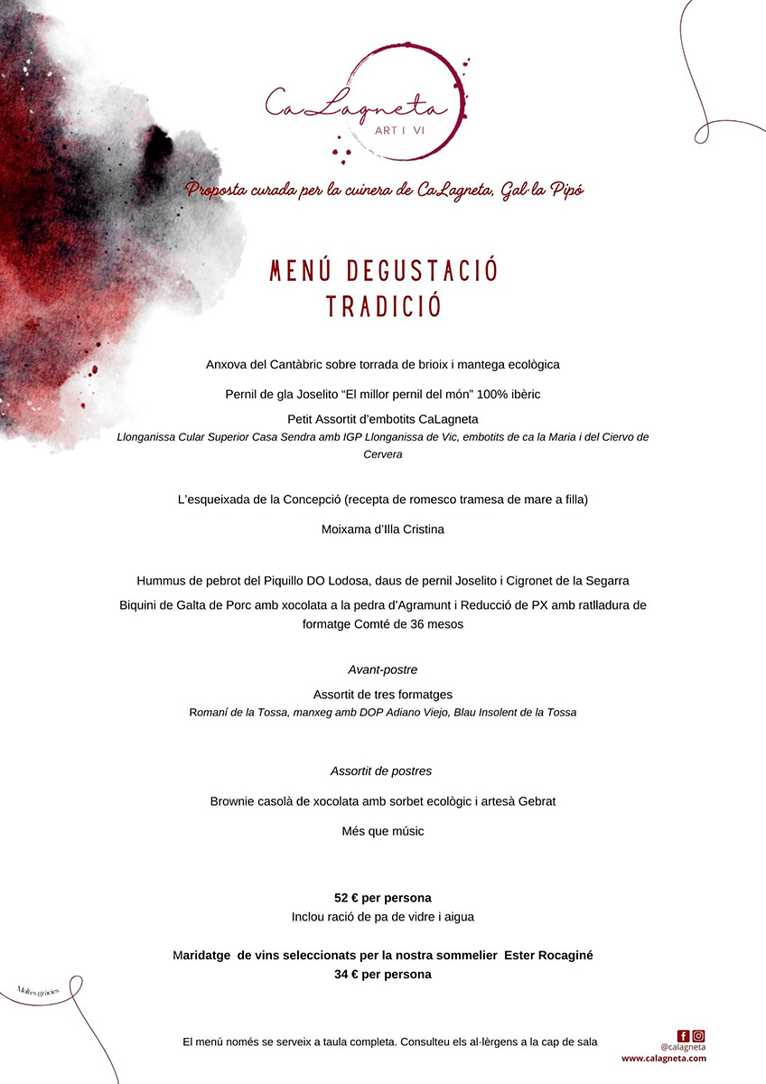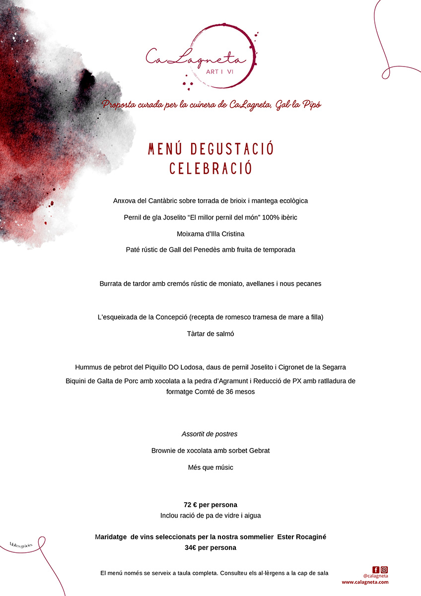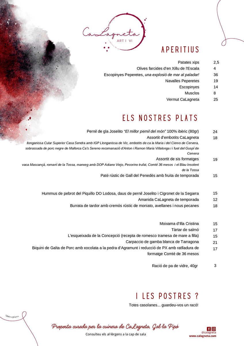 ¿Has comido alguna vez en una galería de arte? Del amor por el producto y por las manos que lo hacen posible, y del homenaje por la cultura del vino que nos conecta a la tierra, a la historia y a la tradición; CaLagneta rinde culto a todo aquello que nos nutre, nos conecta con las raíces y nos invita a compartir alrededor de una mesa. Nuestra carta homenajea el buen producto y los vinos con alma hechos con el corazón.